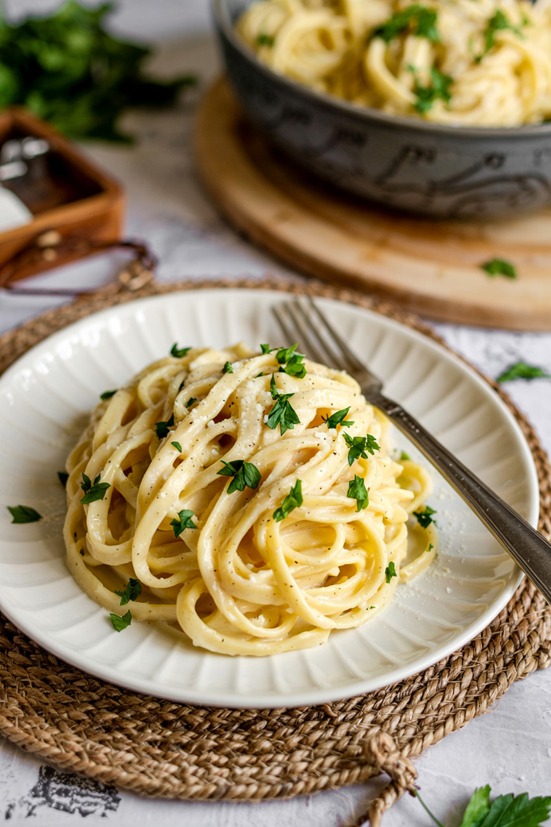 On the Plate: I like to serve this in shallow bowls. I use tongs to twirl the pasta into a nice little pile, then I go heavy with the parmesan and a sprinkle of parsley.