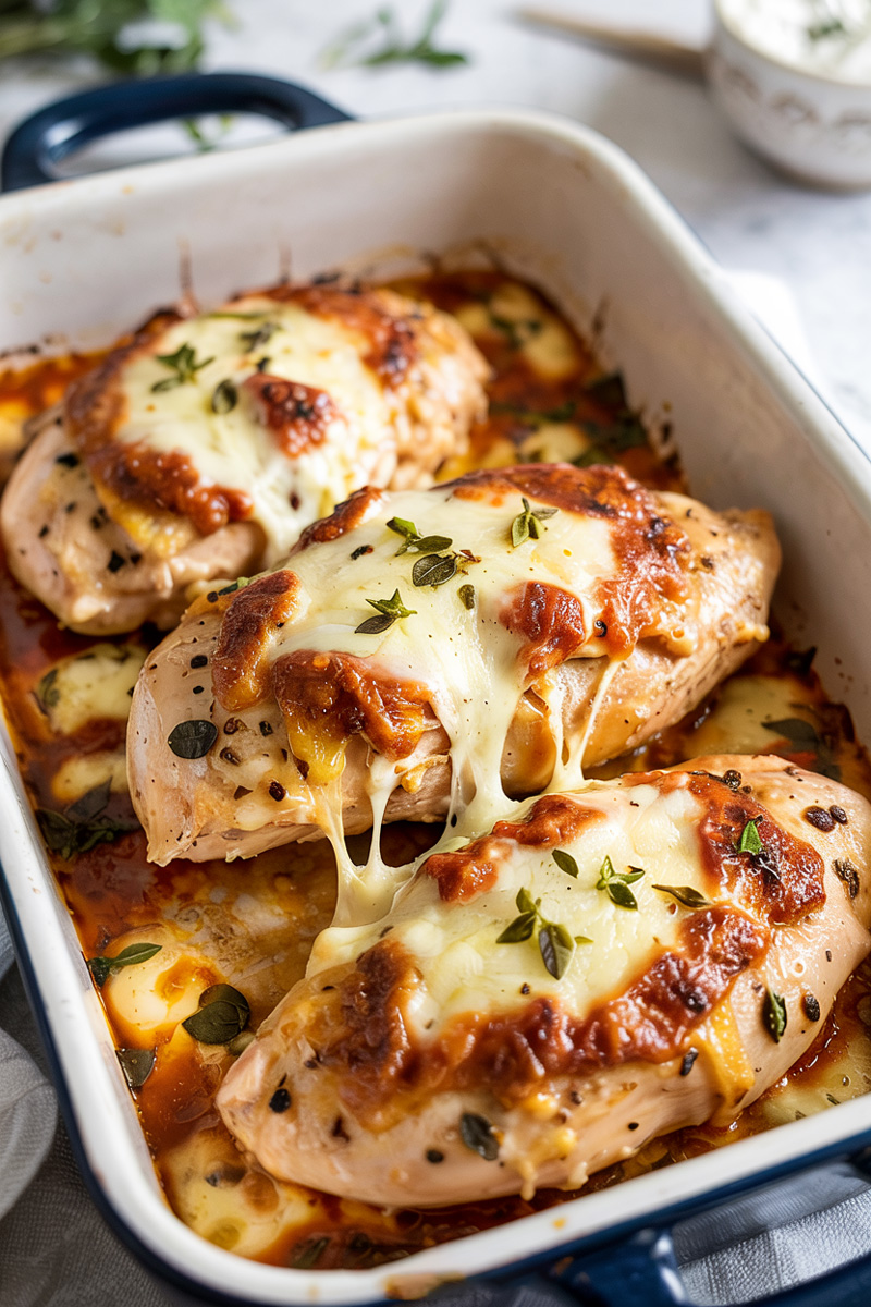 Slide that dish into the hot oven and bake for 20-22 minutes. You’ll know it’s done when the chicken’s internal temperature hits 165°F (74°C), the cheese is completely melted, and the sauce is bubbling around the edges. Your kitchen should smell incredible right about now. If you want the cheese a little more golden and bubbly, you can switch the oven to the broiler for a minute or two. But watch it like a hawk! It can go from golden to burnt in a flash.